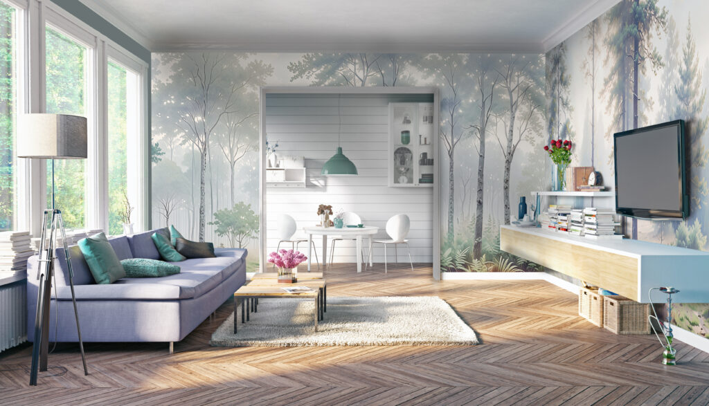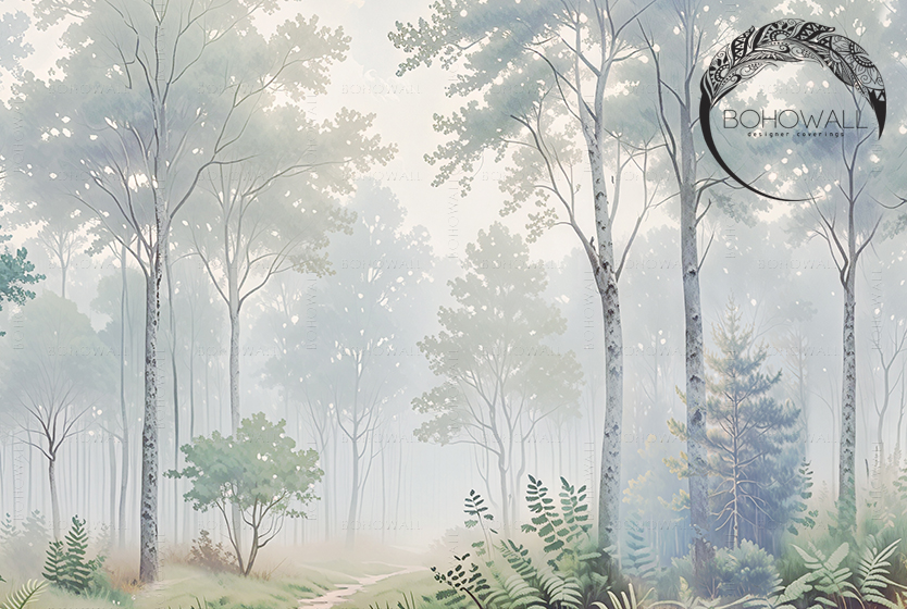 Представьте, что комната растворена в акварельном лесу, не имеющем начала и конца. Это не просто стены — это портал в сияющий мир.
